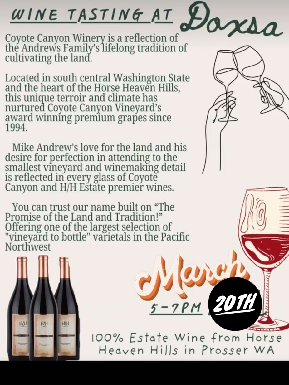Join us March 20th from 5–7pm at Doxsa Social House for a Coyote Canyon Winery Tasting! 🍷